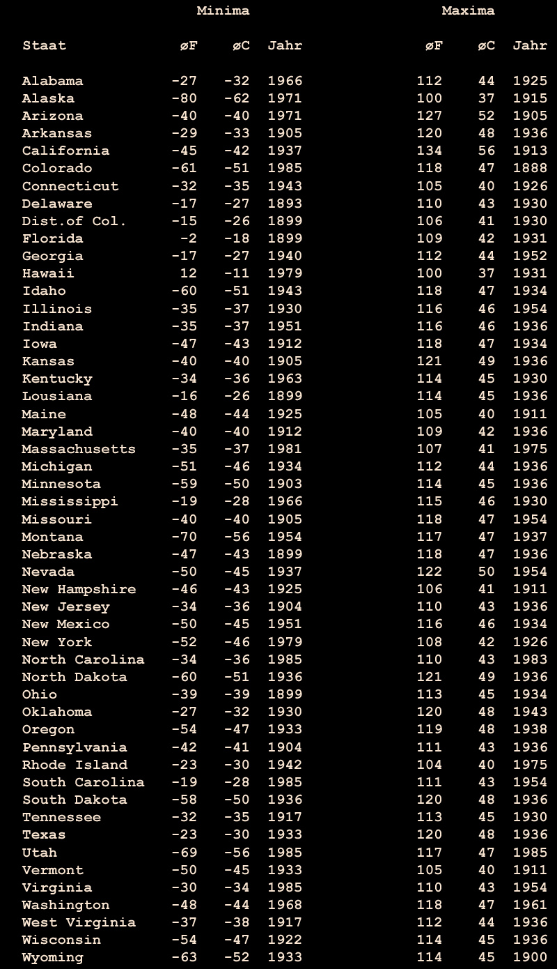 Tabelle der Temperaturextreme bis 1992 (Quelle: American Almanach) Zum Juli 2007: Nach Kälte von Neuseeland bis Schnee in Buenos Aires muss ja davon abgelenkt werden, dass die Globale Erwärmung das Schicksal des Waldsterbens erlebt hat. Zumindest 2007. Differentialgleichungen mit täglich neuen Anfangsbedingungen müssen eben immer wieder zurück auf Feld 1, und das Chaos des Wettergeschehens hat schon existiert, bevor die Politik erfunden wurde... Wie soll das Matterhorn wegen auftauendem Permafrost angeblich zerbröseln bei Tauwetter über 4000 Meter, wenn es Anfangs Juli 2007 um viele Grade kälter ist dort oben als im Januar und die Schneefallgrenze sogar im Sommer auf 2000 Meter absinkt? |