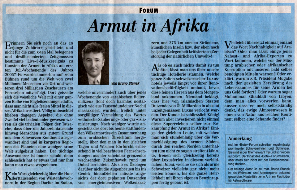 Wenn mörderische Rebellen über 200 Unschuldige feige in den Tod reissen, dann heisst es im letzten Satz schweizerischer Nachrichtenmeldungen verdächtig regelmässig, welche Schlappe die korrupte Regierung wieder einmal kassiert habe. Wenn aber Regierungssoldaten 100 Terroristen ausschalten und dabei vielleicht noch fünf "zufällig" in der Nähe befindliche Zivilisten töten, dann lautet der Kommentar ganz anders: "Hauptleidtragender sei wie immer die Zivilbevölkerung".