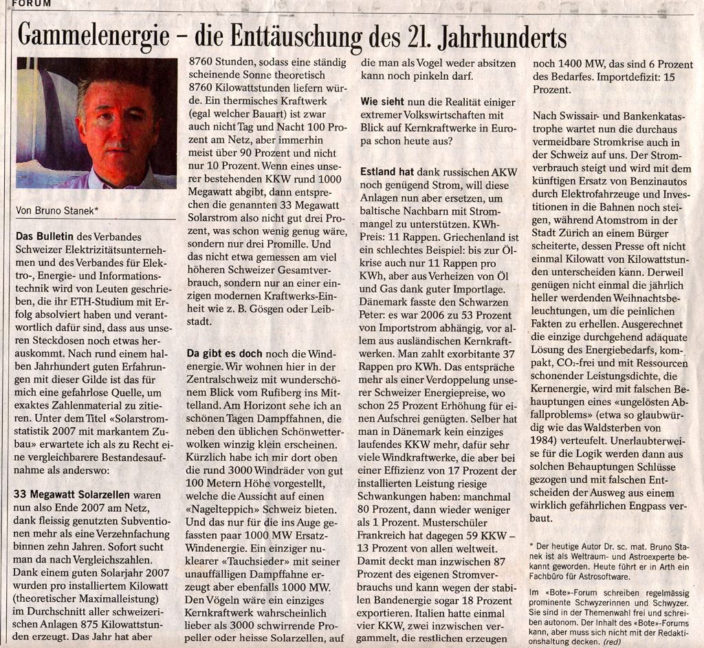 "Der nächste grosse Chlapf nach der Finanzkrise ist die Stromknappheit". Auch sie kommt vom Wunschdenken, und zwar in die Gammelenergien, also im Glauben an Dinge, die es in der gewünschten bzw. versprochenen Form gar nicht gibt. Konkret: CO2-freie elektrische Energie mit genügender Leistungsdichte bei der Gewinnung, so dass die Umwelt minimal belastet wird. Vorsicht mit aller Art von Gammelenergie: Glaube, wer will, denke, wer kann.